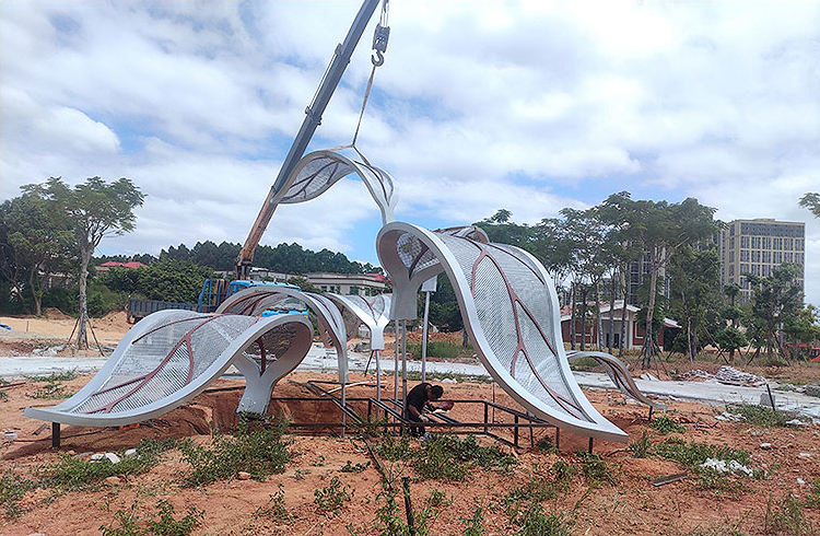 然后,在實(shí)物雕塑制作方面,將圖紙放大到要求尺寸,將不銹鋼板材進(jìn)行切割、焊接等,并經(jīng)過(guò)拋光、噴砂等處理,使其表面光滑,最終完成整個(gè)雕塑。